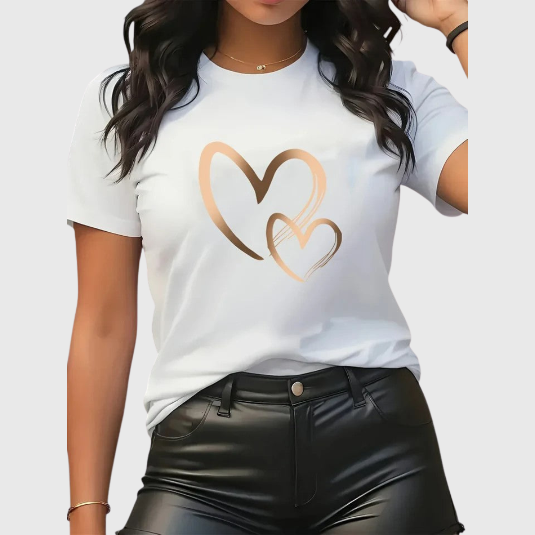 Chic Heart Graphic: This tee features an artistic twin heart print that adds a playful yet sophisticated touch to your everyday style.
